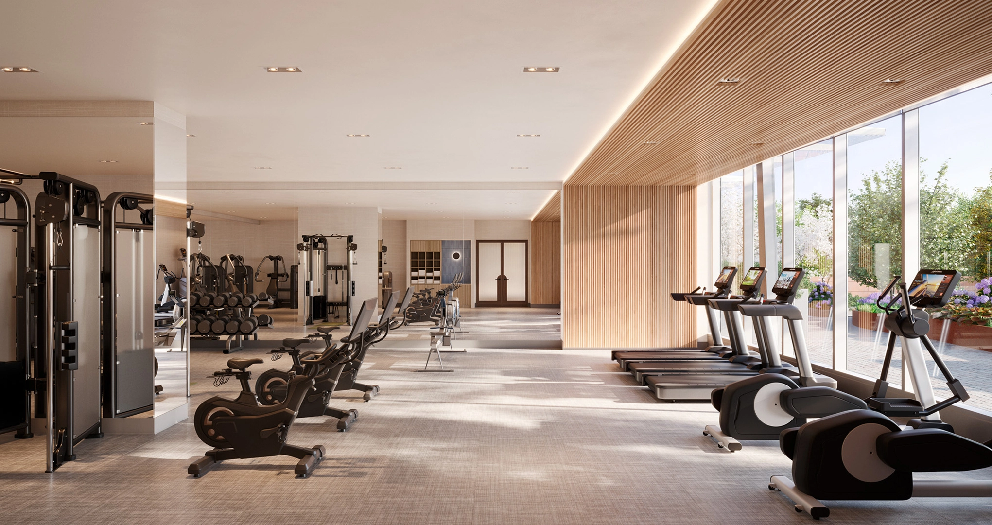- Cardio equipment with TVs, free weights, and multi-gym system