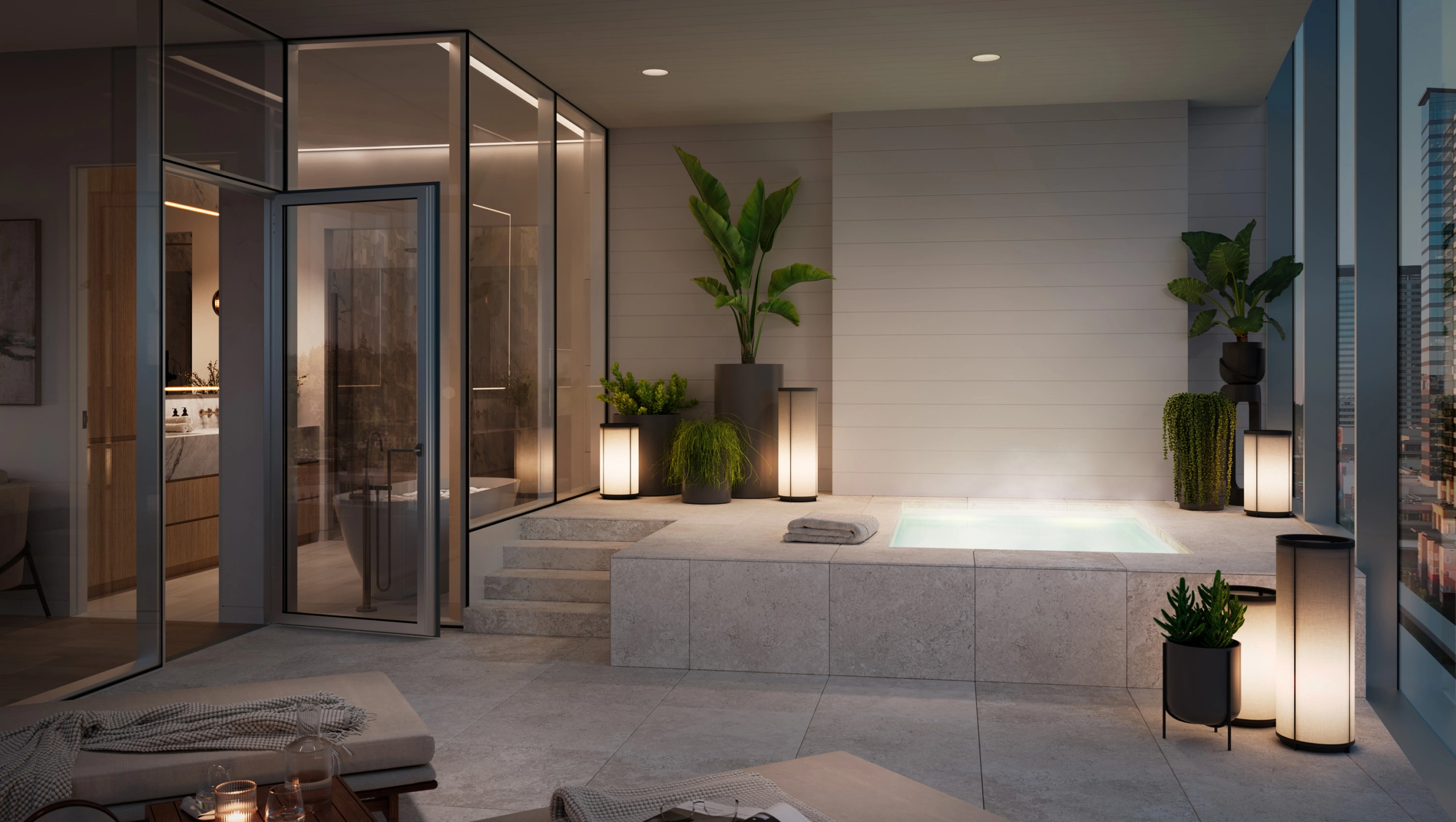 A rare and highly bespoke feature within the Penthouses, is the private indoor / outdoor spa. A private soaking tub with breathtaking views, just outside your primary bedroom.