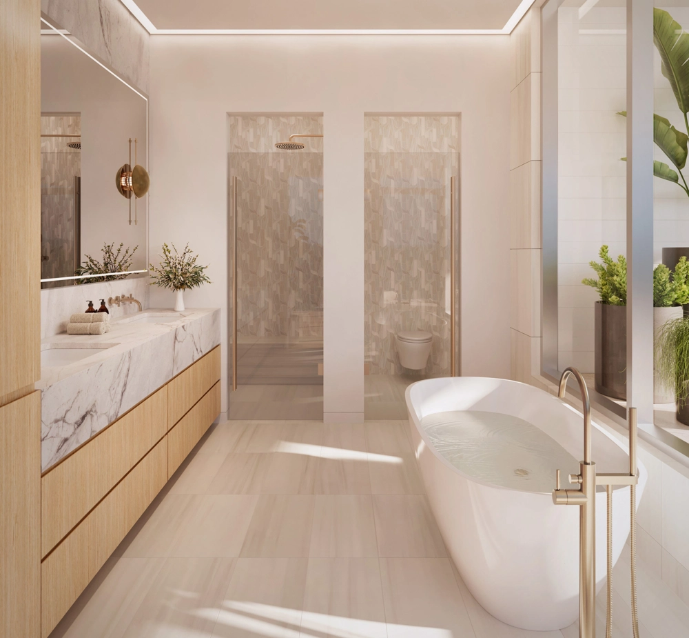 A rare and highly bespoke feature within the Penthouses, is the private indoor / outdoor spa. A private soaking tub with breathtaking views, just outside your primary bedroom.